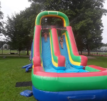 The ultimate summer cool-down for large crowds. This 32-foot inflatable track is designed for maximum throughput, with a 'recycle time' of under 20 seconds per person meaning no long waits in the sun. Featuring super-slick blue vinyl and integrated misting sprays that lead to a splash pool finish, it’s a high-capacity, safe alternative to traditional water slides. Perfect for summer camps, town days, and hot New England festivals.